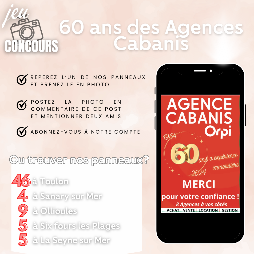 Implantées depuis 6 décennies, les agences immobilières Cabanis Orpi se distinguent par leur expertise dans le marché immobilier varois, notamment à Ollioules, Le Beausset, Sanary, La Cadière d'Azur, Toulon ouest, et Toulon. Que ce soit pour estimer, acheter, vendre, louer ou faire gérer votre bien : Nous travaillons à vos côtés pour concrétiser vos projets immobiliers !