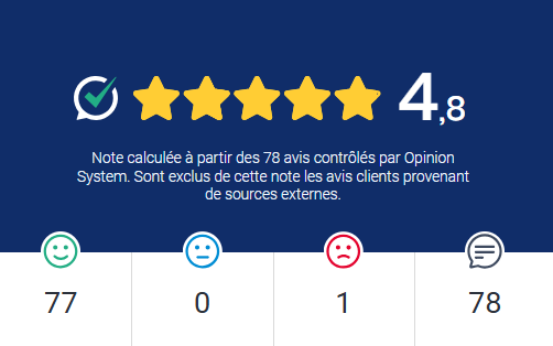 En partenariat avec Opinion System, 100% de nos avis clients sont contrôlés et verifiés.
